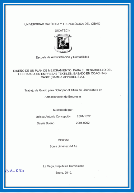 Diseño de un plan de mejoramiento para el desarrollo del Liderazgo, en empresas textiles, basado en coaching. caso: (Camila apparel, S.A) / Julissa Antonia Concepción, Dayris Bueno; Sonia Jiménez, asesor