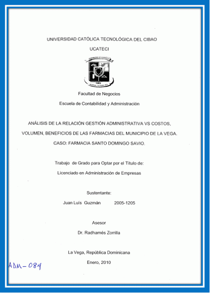 Análisis de la relación gestión administrativa vs. volumen beneficios de las farmacias del municipio de La Vega. Caso: Farmacia Santo Domingo Savio / Juan LUis Guzmán; Radhamés Zorrilla, asesor