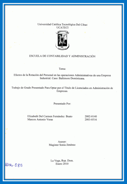 Efectos de la relaci[on del personal en las operaciones administrativas de una empresa industrial. Caso: Baltimore Dominicana / Elizabeth del Carmen Fernández Beato, Marcos Antonio Veras; Sonia Jiménez, asesor