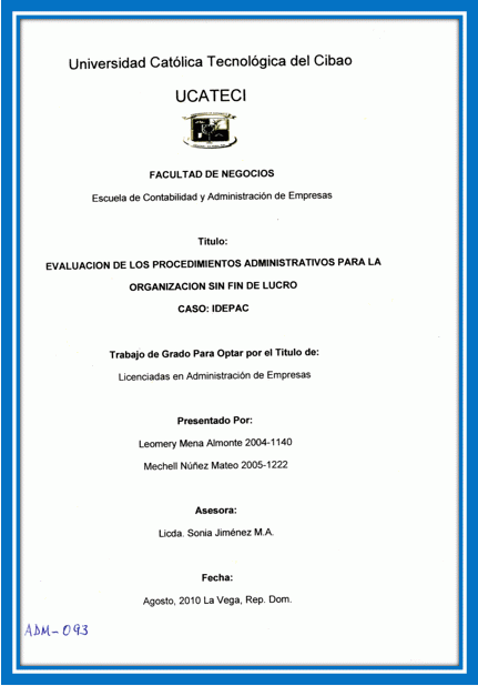 Evaluación de los proceddimientos administrativos para la organización sin fin de lucro. Caso: IDEPAC / Leomery Mena Almonte, Michell Núñez Mateo; Sonia Jiménez, asesor