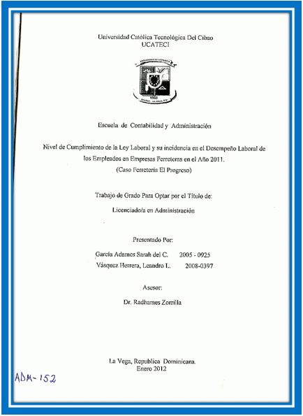 Nivel de cumpliemiento laboral y su incidencia en el desampleño laboral de los empleados en empresas Ferretería en el año 2011. Caso : Ferretería El progreso / Sarah del C. García Adames, Leandro L.,Vásquez Herrera; Radhames Rorrilla, asesor