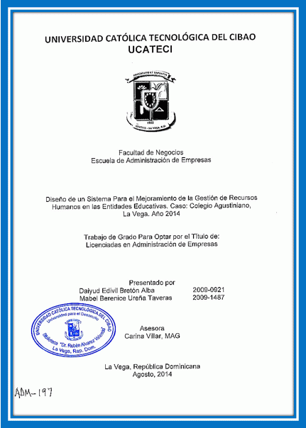 Diseño de un sistema para el mejoramiento de la gestión de recursos humanos en las entidades educativas, caso colegio Agustiniano, La Vega, año 2014 / Daiyud Edivil Bretón Alba, Mabel Berenice Ureña Taveras; Carina Villar, asesor