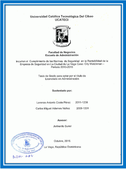 Incurren el cumplimiento de las normas de seguridad en la rentabilidad de la empresa de seguridad en la ciudad de La Vega. Caso : City Watchman, período 2013-2015 / Lorenzo Antonio Coste Pérez, Carlos Miguel Adames Núñez; Jerinerdo Suriel, asesor