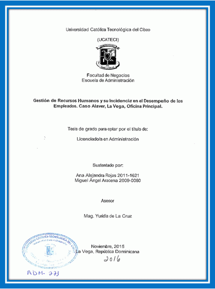Gestión de recursos humanos y su incidencia en el desempeño de los empleados. Caso : ALAVER, La Vega, oficina principal / Ana Alejandra Rojas, Miguel Ángel Aracena; Yuridia de la Cruz, asesor