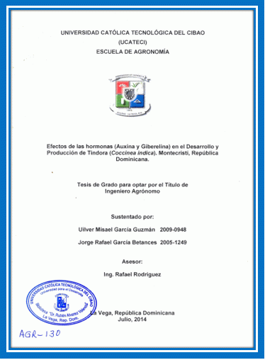 Efectos de las hormonas (Auxina y Giberlina) en el desarrollo y la producción de la Tindora (Coccinea india) Monte Cristu, República Dominicana / Uilver Misael García Guzmán, Jorge Rafael García Betances; Rafael Rodríguez, asesor