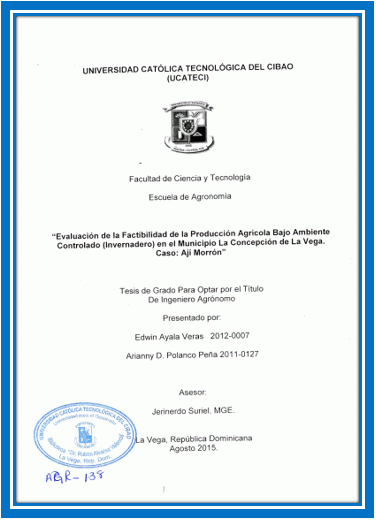 Evaluación de la factibilidad de la producción agricola bajo ambiente controlado (Invernadero) en el municipio de La Vega. Caso : Aji Morrón / Edwin Ayala Veras, Arianny D. Polanco Peña; Jerinerdo Suriel, asesor