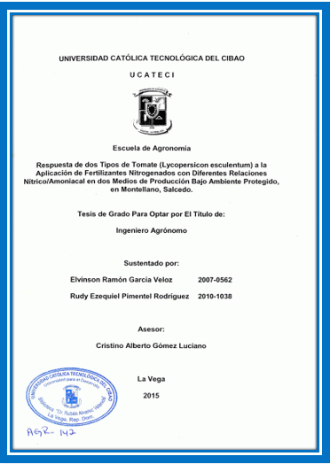 Respuesta de dos tipos de tomate (Lycopersicon esculentum) a la aplicación de fertilizantes nitrogenados con diferentes relaciones nítrito/Amoniacal en dos medios de producción bajo ambiente protegido, en Montellano, Salcedo / Elvison Ramón García Vel