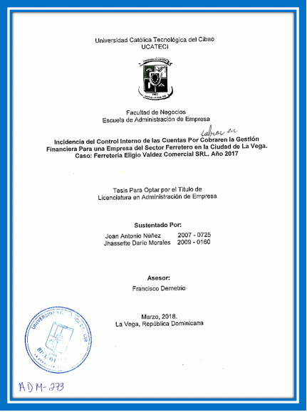 Incidencia del control interno de las cuentas por cobrar en la gestión financiera para una empresa del sector ferretero en la ciudad de La Vega. Caso : Ferreteria Eligio Veldez Comercial SRL. Año 2017 / Juan Antonio Núñez, Jhassette Darío Morales; Francisco Demetrio, asesor