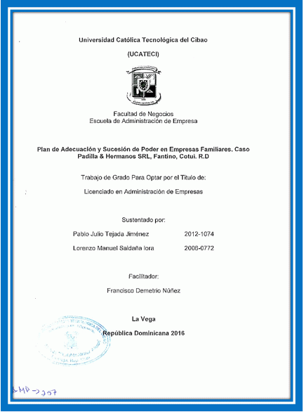 Plan de adecuación y sucesión de poder en empresas familiares. Caso : Padilla y Hermanos SRL, Fantino, Cotui, República Dominicana / Pablo Julio Tejada Jiménez, Lorenzo Manuel Saldaña Lora; Francisco Demetrio Núñez, asesor