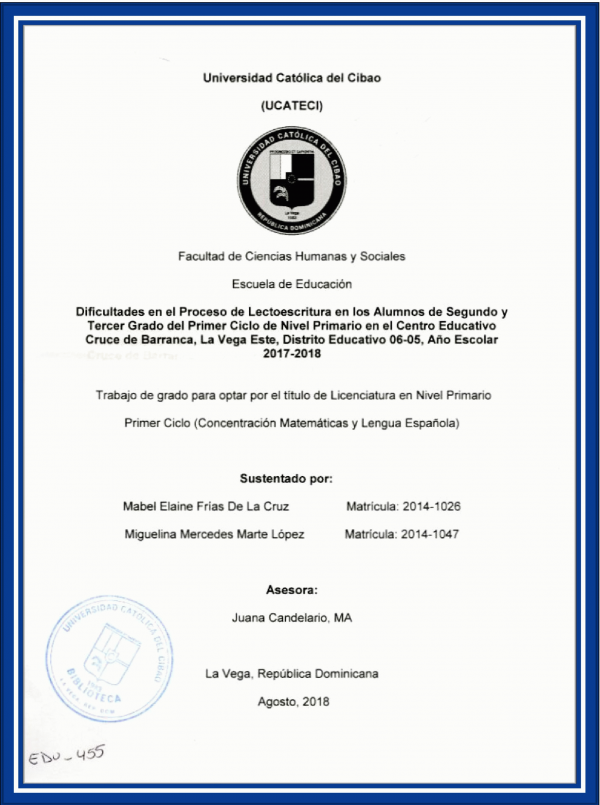 Dificultades en el proceso de lectoescritura en los alumnos de segundo y tercer grado del primer ciclo de nivel primario en el Centro Educativo Cruce de Barranca, La Vega Este, Distrito Educativo 06-05, año escolar 2017-2018 / Mabel Elaine Frías De La Cruz, Miguelina Mercedes Marte López ; asesor Juana Candelario