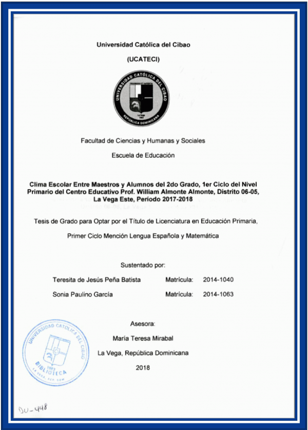Clima escolar entre maestros y alumnos del 2do. grado, 1er ciclo del nivel primario del centro educativo Prof. William Almonte Almonte, Distrito 06-05, La Vega Este, periodo 2017-2018 / Teresita de Jesús Peña Batista, Sonia Paulino García ; asesor María Teresa Mirabal
