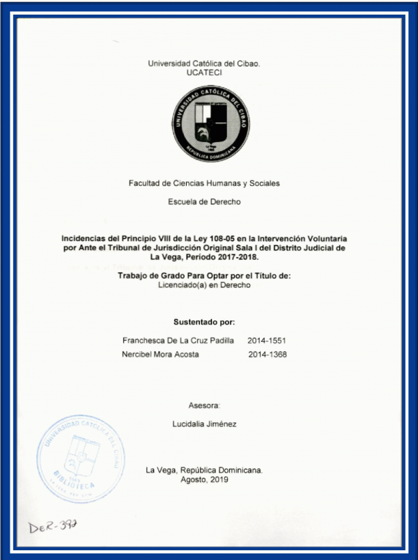 Incidencias del Principio VIII de la Ley 108-05 en la intervención voluntaria por ante el Tribunal de Jurisdicción Original Sala I del Distrito Judicial de La Vega, período 2017-2018 / Franchesca de la Cruz Padilla, Nercibel Mora Acosta, asesor Lucidalia Jiménez
