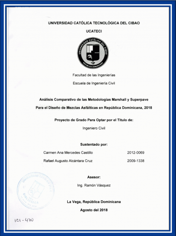 Análisis comparativo de las metodologías Marshall y Superpave para el diseño de mezclas asfálticas en República Dominicana, 2018 / Carmen Ana Mercedes Castillo, Rafael Augusto Alcántara Cruz; asesor Ramón Vásquez