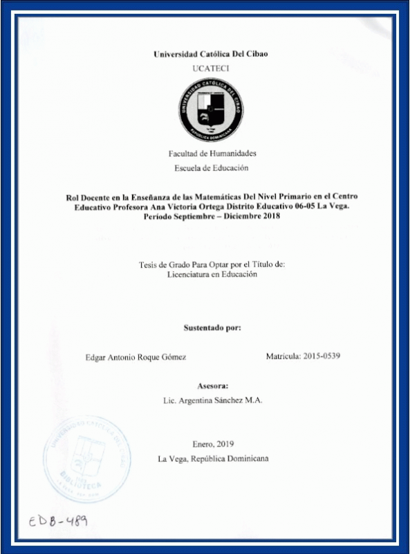 Rol docente en la enseñanza de las matemáticas del nivel primario en el Centro Educativo Profesora Ana Victoria Ortega, Distrito Educativo 06-05, La Vega, período septiembre-diciembre 2018 / Edgar Antonio Roque Gómez ; asesor Argentina Sánchez