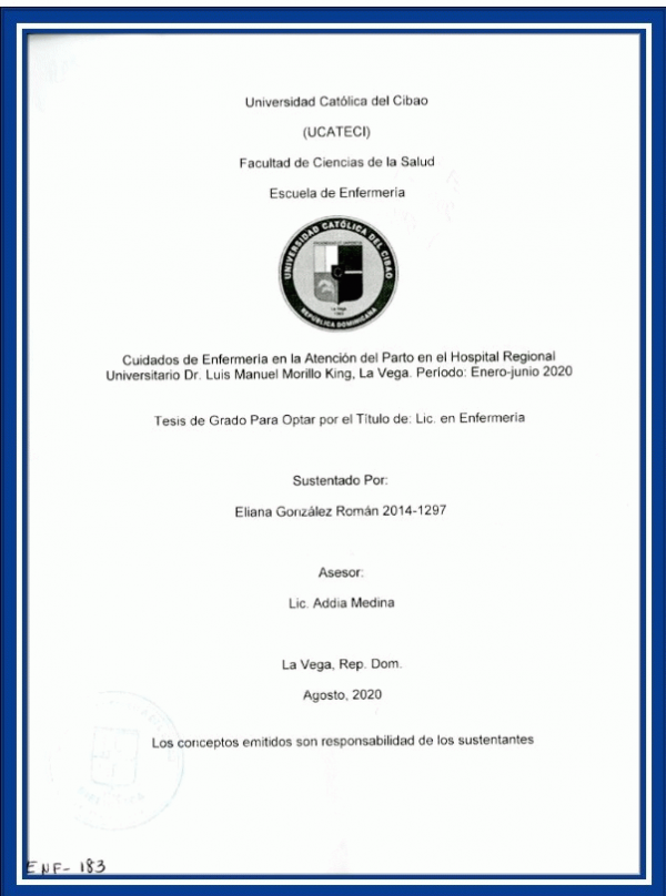 Cuidados de enfermería en la atención del parto en el Hospital Regional Universitario Dr. Luis Manuel Morillo King, La Vega, período: enero-junio 2020 / Eliana González Román; asesor Addia Medina