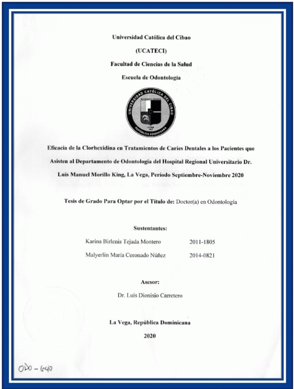 Eficacia de la clorhexidina en tratamientos de caries dentales a los pacientes que asisten al Departamento de Odontología del Hospital Regional Universitario Dr. Luis Manuel Morillo King, La Vega, período septiembre-noviembre 2020 / Karina Birlenis Tejada Montero, Malyerlin María Coronado Núñez; asesor Luis Dionisio Carretero