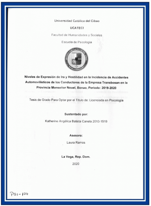 Niveles de expresión de ira y hostilidad en la incidencia de accidentes automovilísticos de los conductores de la empresa Transbosan en la provincia Monseñor Nouel, Bonao, período: 2019-2020 / Katherine Angélica Batista Canela; asesor Laura Ramos
