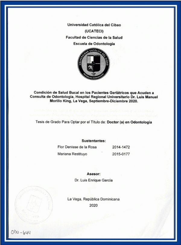 Condición de salud bucal en los pacientes geriátricos que acuden a consulta de odontología, Hospital Regional Universitario Dr. Luis Manuel Morillo King, La Vega, septiembre-diciembre 2020/ Flor Denisse de la Rosa, Mariana Restituyo; asesor Luis Enríque García