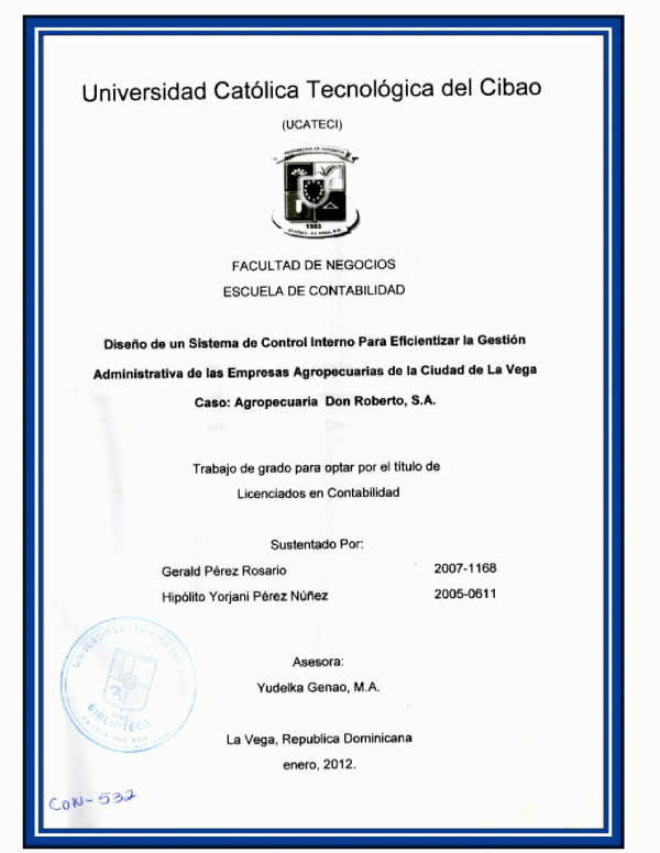 Diseño de un sistema de control interno para eficientizar la gestión administrativa de las empresas agropecuarias de la ciudad de La Vega. Caso: Agropecuaria Don Roberto, S.A. Gerald Pérez Rosario, Hipólito Yorjani Pérez Núñez; asesor Yudelka Genao