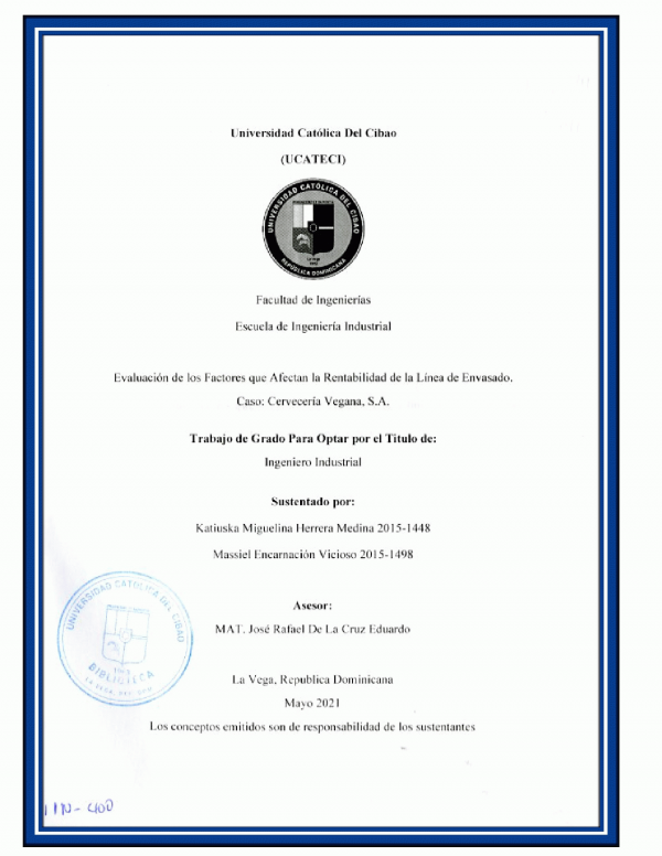 Evaluación de los factores que afectan la rentabilidad de la línea de envasado. Caso: Cervecería Vegana, S.A. / Katiuska Miguelina Herrera Medina, Massiel Encarnación Vicioso; asesor José Rafael de la Cruz Eduardo