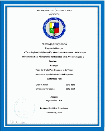 La tecnología de la información y las comunicaciones,"tics" como herramienta para aumentar la rentabilidad en Arrocera Tejada y Sánchez / Erich R. Meier, Christopher R. Cosme; asesor Ányelo de la Cruz