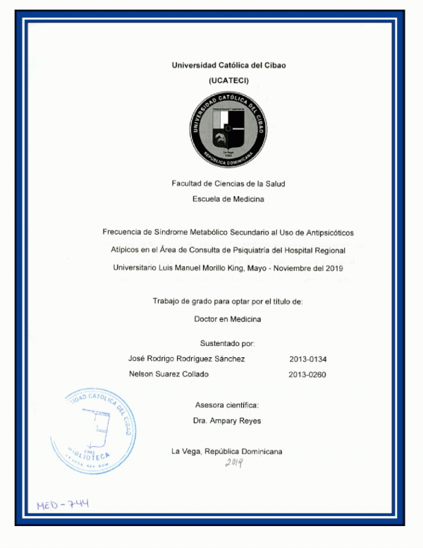 Frecuencia de síndrome metabólico secundario al uso de antisicóticos atípicos en el área de consulta de psiquiatría del Hospital Regional Universitario Dr. Luis Manuel Morillo King, mayo - noviembre del 2019 / José Rodrigo Rodríguez Sánchez, Nelson Suárez Collado; asesor Ampary Reyes
