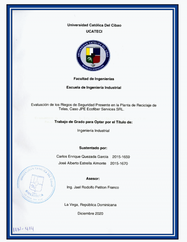 Evaluación de los riegos de seguridad presente en la planta de reciclaje de telas, caso JPE ECOFIBER Services SRL. / Carlos Enríque Quezada García, José Alberto Estrella Almonte; asesor Jael Rodolfo Petitón Franco