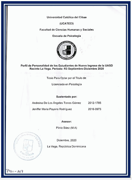 Perfil de personalidad de los estudiantes de nuevo ingreso de la UASD Recinto La Vega. Período: R3 septiembre-diciembre 2020 / Andreina de los Ángeles Torres Gómez, Jeniffer María Payano Rodríguez; asesor Plinio Báez