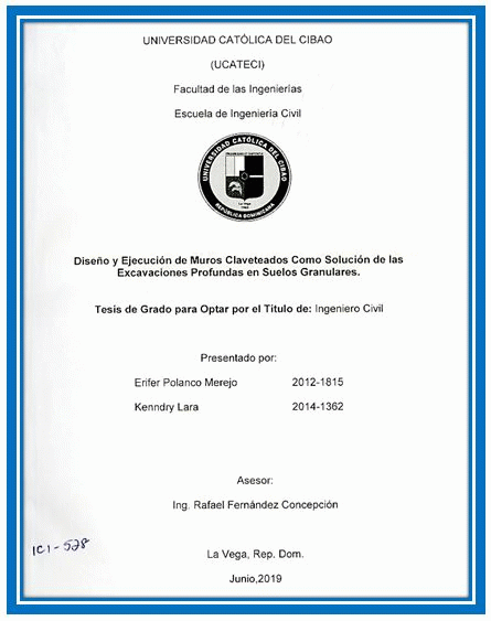 Diseño y ejecución de muros claveteados como solución de las excavaciones profundas en suelos granulares / Erifer Polanco Merejo, Kenndry Lara; asesor Rafael Fernández Concepción