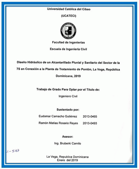 Diseño hidráulico de un alcantarillado pluvial y sanitario del Sector de la 7s en conexión a la Planta de Tratamiento de Pontón, La Vega, República Dominicana, 2019 / Eudomar Camacho Gutiérrez, Ramón Matías Rosario Reyes; asesor Bruberkis Camilo
