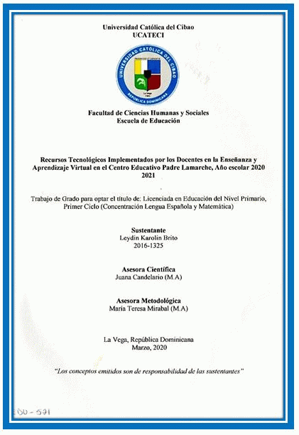 Recursos tecnológicos implementados por los docentes en la enseñanza y aprendizaje virtual en el Centro Educativo Padre Lamarche año Escolar 2020 / Leydin karolin Brito; asesor Juana Candelario, María Teresa Mirabal