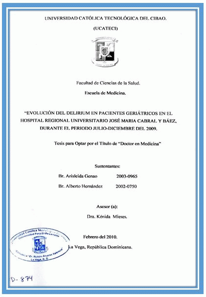 Evolución del deliruim en pacientes geriátricos en el Hospital Regional Universitario José María Cabral y Báez durante el periodo julio-diciembre del 2009 / Arisleida Genao, Alberto Hernández; asesor Kenida Mieses