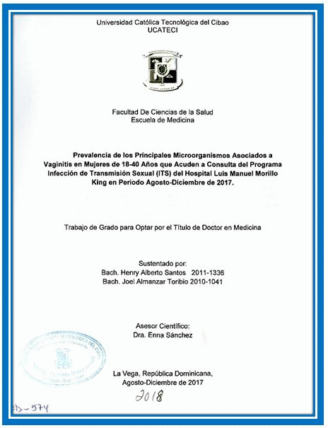 Prevalencia de los principales microorganismos asociados a vaginitis en mujeres de 18-40 años que acuden a consulta del Programa Infección de Transmisión Sexual (ITS) del Hospital Dr. Luis Manuel Morillo King, en el periodo agosto-diciembre 2017 / Henry Alberto Santos, Joel Almánzar Toribio; asesor Enna Sánchez