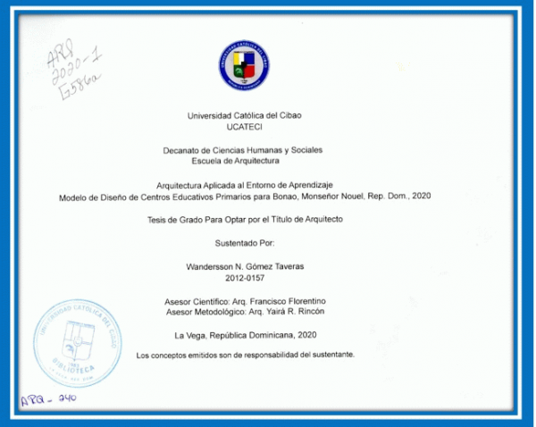 Arquitectura aplicada al entorno de aprendizaje. Modelo de diseño de Centros Educativos Primarios para Bonao, Monseñor Nouel, Rep. Dom., 2020 / Wandersson N. Gómez Taveras; Francisco Florentino, Yairá Rincón