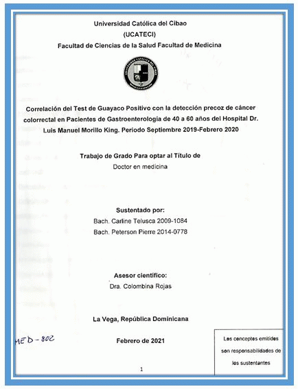 Correlación del Test de Guayaco Positivo con la detección precoz de cáncer colorrectal en pacientes de gastroenterología de 40 a 60 años del Hospital Dr. Luis Manuel Morillo King, Período septiembre 2019 - febrero 2020 / Cerline Telusca, Peterson Pierre; asesor Colombina Rojas