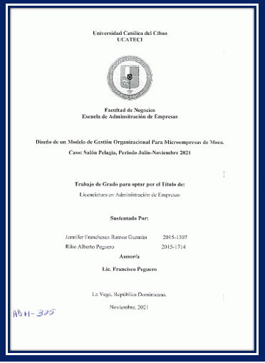 Diseño de un modelo de gestión organizacional para microempresas de Moca. Caso: Salón Pelagia, período julio-noviembre 2021 / Jennifer Franchesca Ramos Guzmán, Riko Alberto Peguero; asesor Francisco Peguero