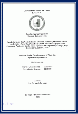 Rendimiento de dos variedades de chinola: Purpura (Passiflora edulis, var. Edulis) y amarilla (Passiflora edulis, var. Flavicarpa) usando espaldera, postes en mantel y dos fertilizantes orgánicos; La Vega, República Dominicana, octubre 2020 / Stanley Ureña Garrido, Danny Daniel Jiménez; asesor Fernando de León