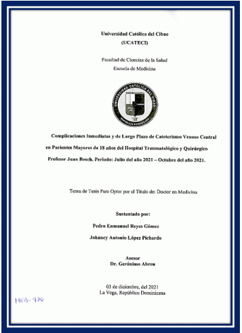 Complicaciones inmediatas y de largo plazo de cateterismo venoso central en pacientes mayores de 18 años del Hospital Traumatológico y Quirúrgico Profesor Juan Bosch. Período: Julio del año 2021-octubre del año 2021 / Pedro Enmanuel Reyes Gómez, Johancy Antonio López Pichardo; asesor Gerónimo Abreu