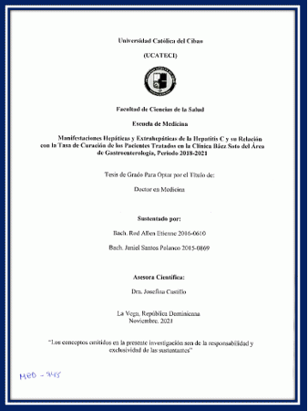 Manifestaciones hepáticas y extrahepáticas de la Hepatitis C y su relación con la tasa de curación de los pacientes tratados en la Clínica Báez Soto del área de Gastroenterología, período 2018-2021 / Rod Allen Etienne, Janiel Santos Polanco; asesor Josefina Castillo