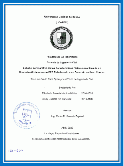 Estudio comparativo de las características físico-mecánicas de un concreto aliviado con eps relacionado a un concreto de peso normal / Elizabeth Antonia Medina Núñez, Cindy Lissette Nin Sánchez; asesor Pedro M. Rosario Espinal