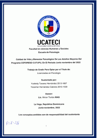 Calidad de vida y bienestar psicológico de los adultos mayores del Programa CEFORESO CUTUPÚ, en el período junio-noviembre del 2022 / Yusleidy Tavarez Hernández, Yessimer Hernández Cabrera; asesor Mirian Toribio