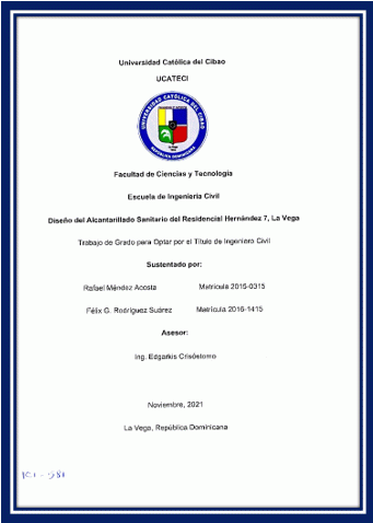 Diseño del alcantarillado sanitario del Residencial Hernández 7, La Vega / Rafael Méndez Acosta, Félix G. Rodriguez Suárez; asesor Edgarkis Crisóstomo