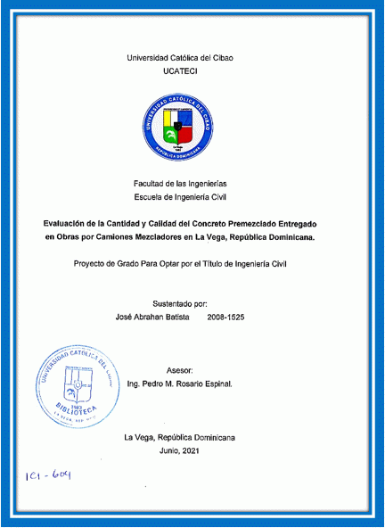 Evaluación de la cantidad y calidad del concreto premezclado entregado en obras por camiones mezcladores en La Vega, República Dominicana / José Abrahan Batista; asesor Pedro M. Rosario Espinal