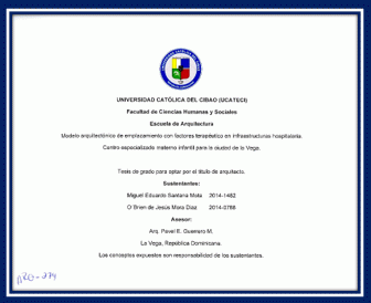 Modelo arquitectónico de emplazamiento con factores terapéuticos en infraestructuras hospitalarias, Centro Especializado Materno Infantil para la ciudad de La Vega / Miguel Eduardo Santana Mota, O’Brien de Jesús Mora Díaz; asesor Pavel E. Guerrero M.