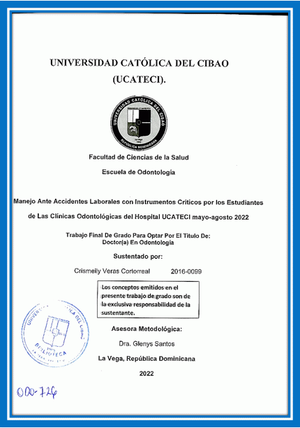 Manejo ante accidentes laborales con instrumentos críticos por los estudiantes de las Clínicas Odontológicas del Hospital UCATECI mayo-agosto 2022 / Crismeily Veras Cortorreal; asesor Glenys Santos
