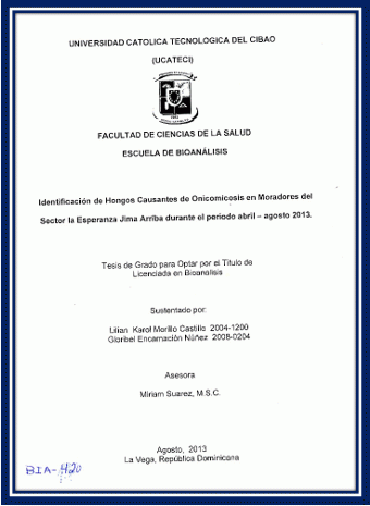 Identificación de hongos causantes de onicomicosis en moradores del sector la Esperanza Jima Arriba durante el periodo abril- agosto 2013 / Lilian Karol Morillo Castillo, Gloribel Encarnación Núñez; asesor Miriam Suarez