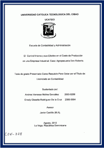 El Control interno y sus efectos en el costo de producción en una empresa industrial. Caso:Agropecuaria Don Roberto / Andrea Vanessa Molina González, Emely Gissette Rodríguez De La Cruz; asesor Javier Castillo