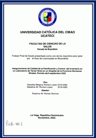 Aseguramiento de calidad de la planificación y control del inventario en un laboratorio de tercer nivel en un hospital de la provincia Hermanas Mirabal, período abril-septiembre 2022 / Dianelba Milagros Romero López, Madeline Alt. Romero López; asesor Rosanny Alt. Roman Ramírez