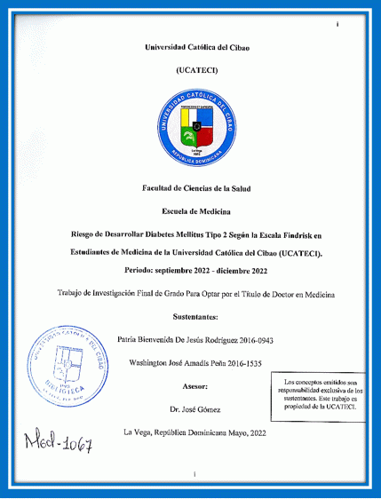 Riesgo de desarrollar diabetes mellitus tipo 2 según la escala findrisk en estudiantes de medicina de la Universidad Católica del Cibao (UCATECI). Periodo septiembre 2022-diciembre 2022 / Patria Bienvenida De Jesús Rodríguez, Washintgon José Amadís Peña; asesor José Gómez