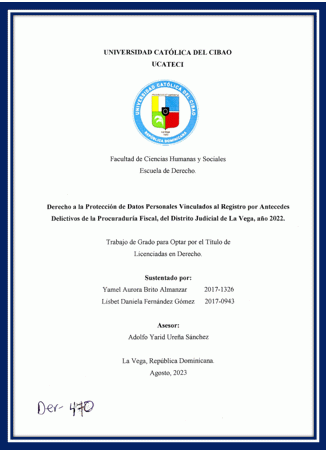Derecho a la protección de datos personales vinculados al registro por antecedes delictivos de la Procuraduría Fiscal, del Distrito Judicial de La Vega, año 2022 / Yamel Aurora Brito Almanzar, Lisbet Daniela Fernández Gómez; asesor Adolfo Yarid Ureña Sánchez